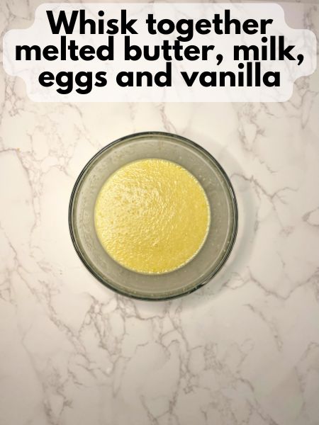 - In another bowl, whisk melted butter, milk, eggs, and vanilla until smooth.
