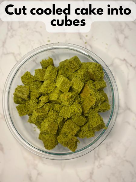 - Slice the cooled matcha shortcake into 1-inch cubes