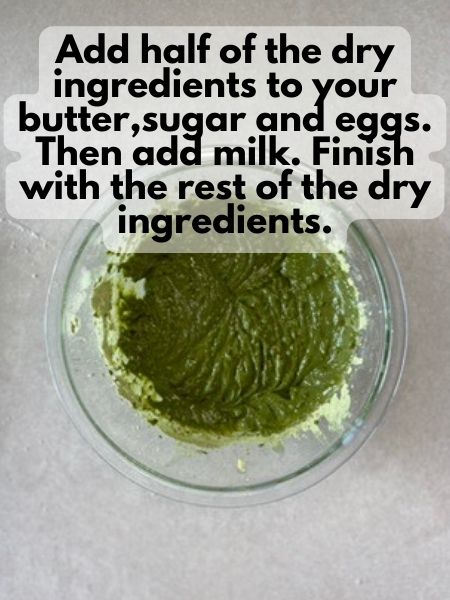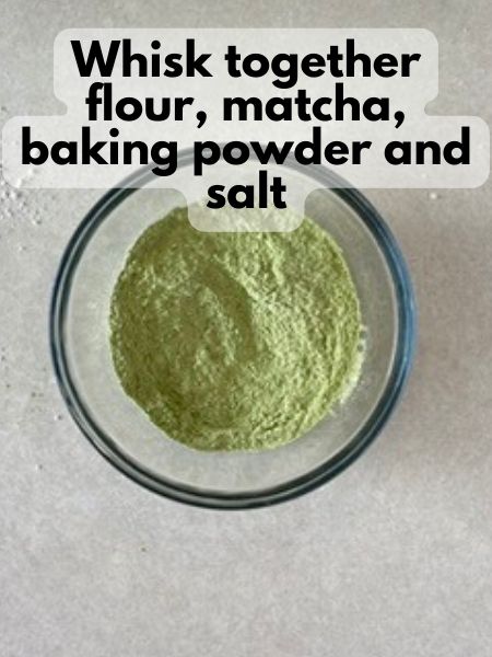 - In a separate bowl, whisk together your flour, baking powder, salt and matcha.