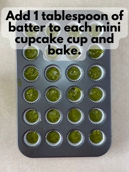 - Spoon your cupcake batter into your prepared pan. You’ll need 1 tablespoon of batter per mini cupcake.