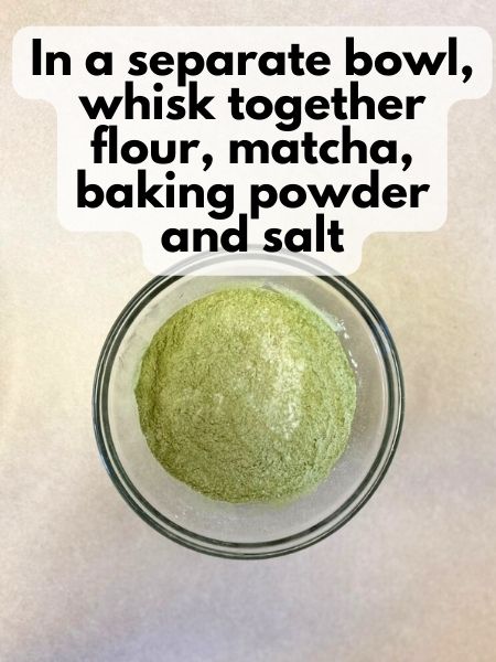 4. In a separate bowl, whisk together your flour, baking powder, salt and matcha.