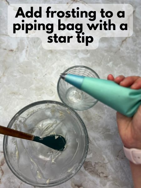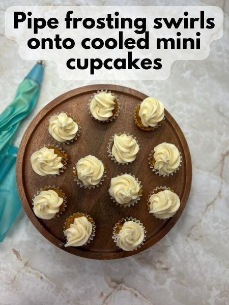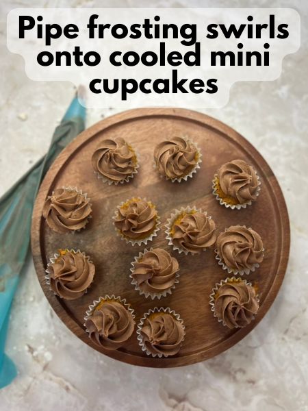 - Add frosting to a piping bag with a tip (I like the Wilton 1M tip) and pipe swirls onto your cooled mini cupcakes.