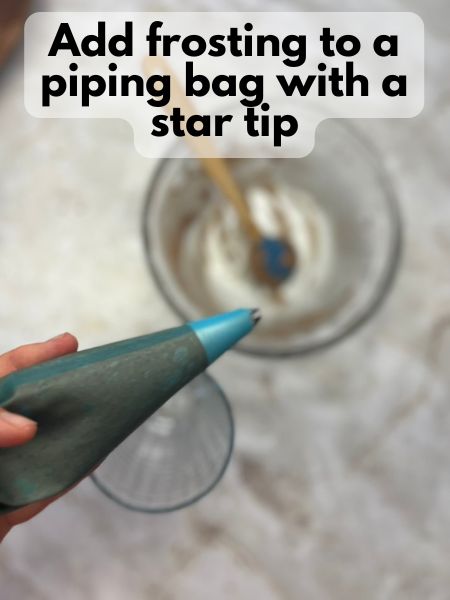 - Add your frosting to a piping bag with a tip (I liked the Wilton 1M tip) and pipe swirls onto your cooled mini cupcakes