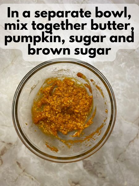 - In a separate bowl, beat together the butter, pumpkin, sugar and brown sugar until smooth.