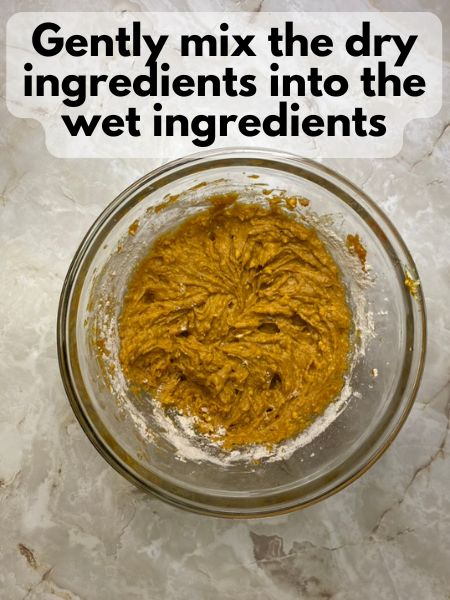 - Gradually add the dry ingredients into the wet mixture, mixing until just combined.