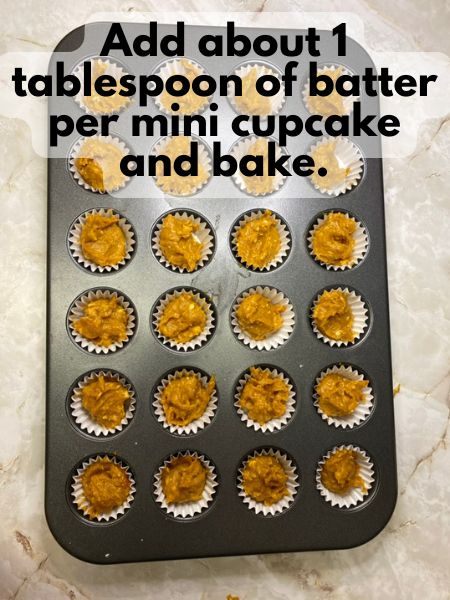 - Once your batter is ready, scoop it into the lined mini cupcake tins, filling each about 2/3 full. You’ll need about 1 tablespoon of batter per mini cupcake.