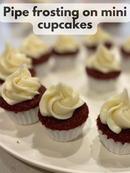 - Transfer the frosting to a piping bag with a star tip (I like the Wilton 1M tip) and swirl it onto each cupcake. Add a sprinkle of red velvet crumbs or festive sprinkles to make them truly special.