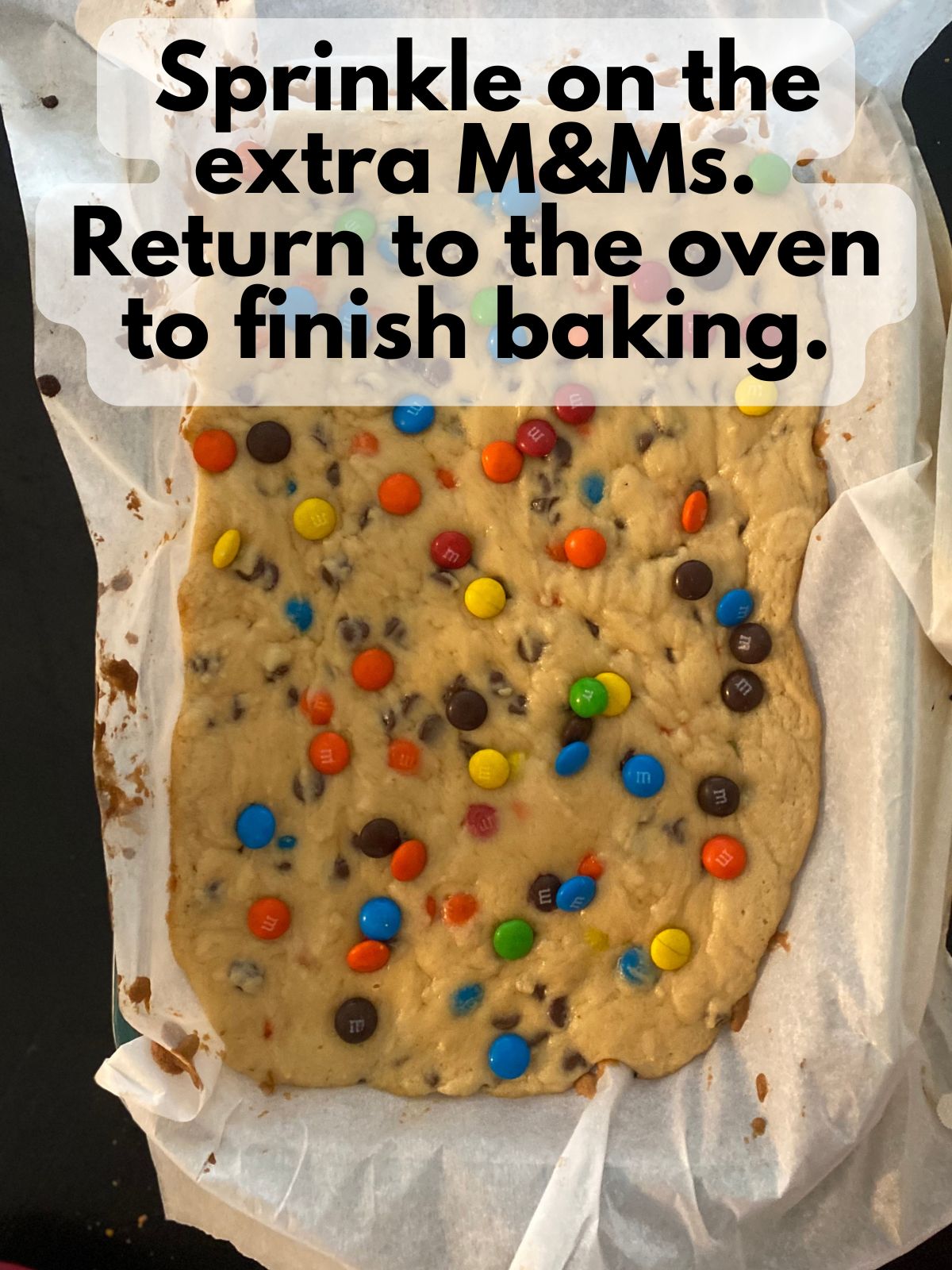 6. Add M&Ms: Remove the pan from the oven and sprinkle some extra M&Ms across the top. This keeps them colorful and on the surface.