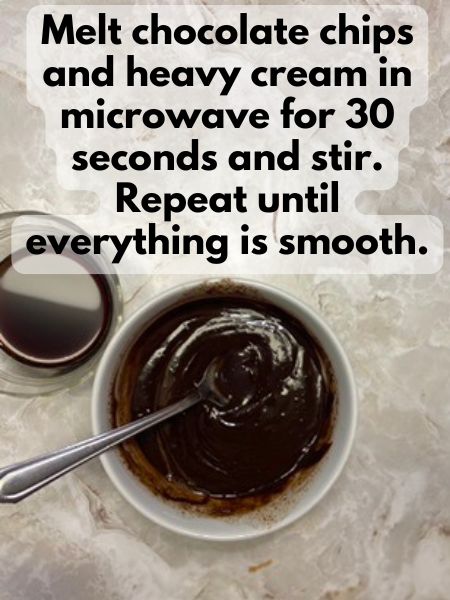 - Microwave Heavy Cream and Chocolate Chips: In 20-30 second increments and stir in-between each round in the microwave. Keep microwaving and stirring until the mixture is smooth.