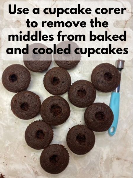 - Core the center of each cupcake using a cupcake corer or a small knife. Be careful not to go all the way to the bottom.