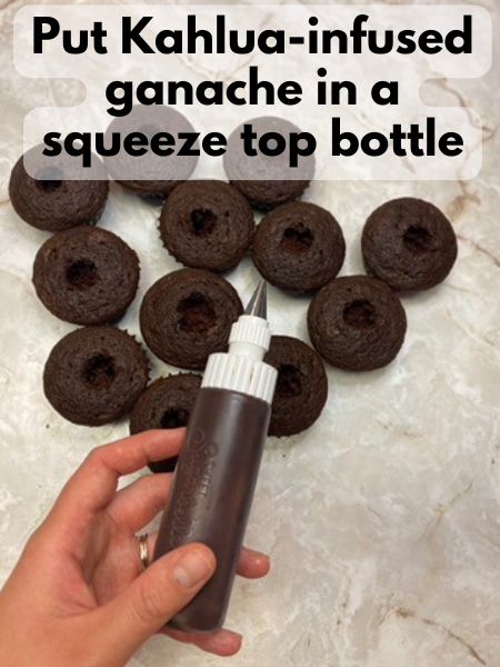 - Put the Kahlua-infused ganache in a squeeze-top bottle. This is optional, but it helps with filling the cupcakes.