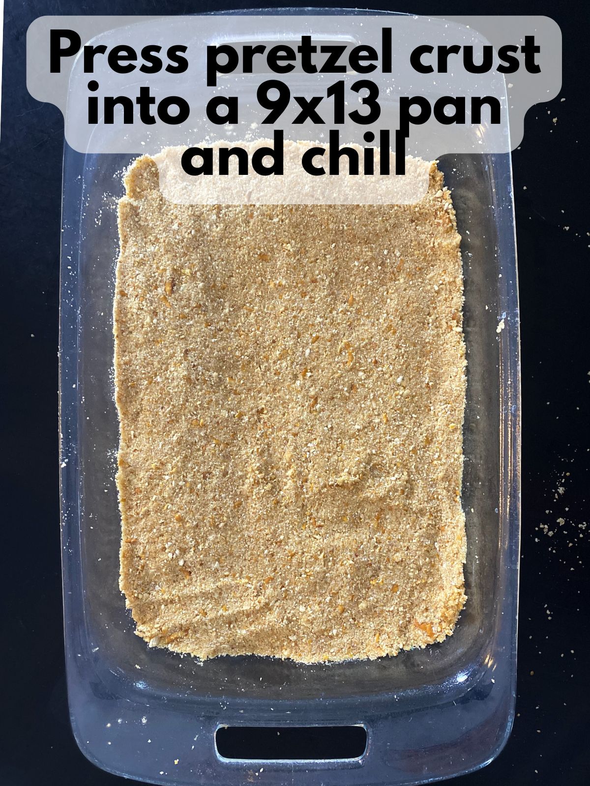 - Go finer on the crust. the more finely you crush the pretzels, the better the crust holds together and slices. To get really fine pretzel crumbs, use a bullet blender to crush your pretzels. Also, pack your crust down as much as you can. Press it down hard in the pan, especially at the edges.