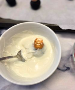 - Remove Oreo balls from the freezer, dip the bottom of each Rolo in the melted chocolate and carefully stick the Rolo to the top of your Oreo ball.