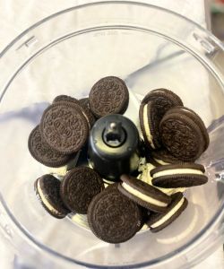 1. Start by placing your cream cheese and Oreos in a food processor. I recommend placing the cream cheese on the bottom. It just seems to mix in faster that way, in my opinion.