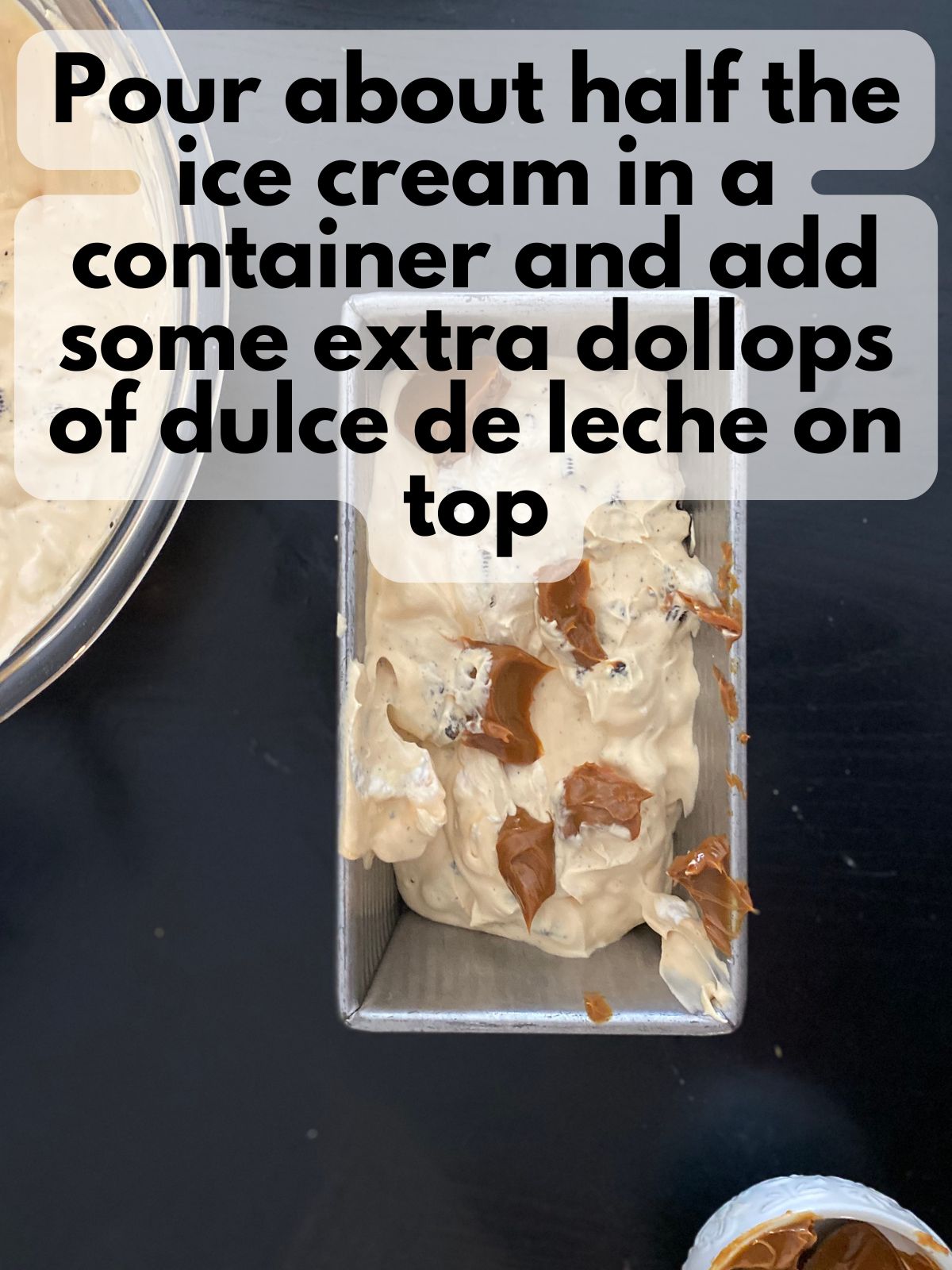 Pour half the mixture into a 9×5-inch loaf pan or freezer-safe container. Add spoonfuls of dulce de leche and swirl with a knife or skewer (If you can, quickly heat the dulce de leche in the microwave for only 5-ish seconds to make it more spreadable). Add the remaining ice cream mixture and repeat with more dulce de leche swirls. Sprinkle the reserved Oreos on top.