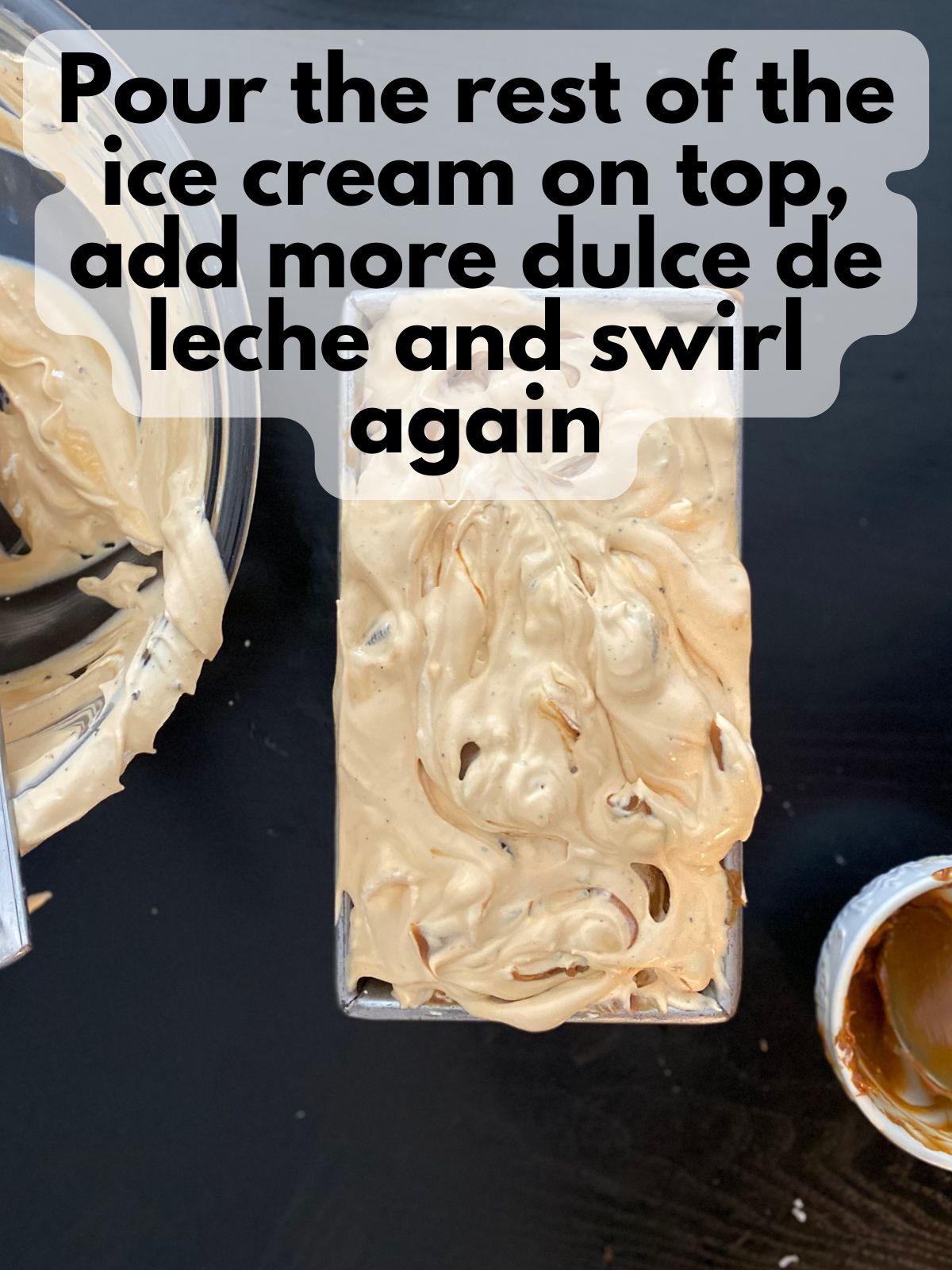 - Pour half the mixture into a 9×5-inch loaf pan or freezer-safe container. Add spoonfuls of dulce de leche and swirl with a knife or skewer (If you can, quickly heat the dulce de leche in the microwave for only 5-ish seconds to make it more spreadable).