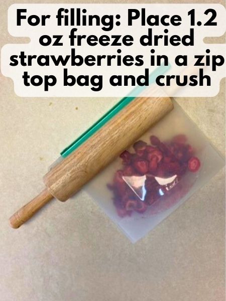 2. Crush 1.2 oz of freeze dried strawberries into a fine powder. You can put them in a thick reusable sandwich bag and crush them with a rolling pin.