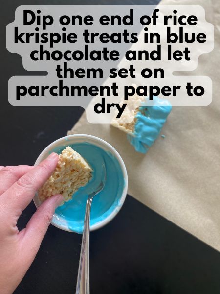 - Dip one end of each Rice Krispie rectangle into the chocolate so it looks like it’s sitting in a pool. Place the dipped treats on parchment paper and let the chocolate set.