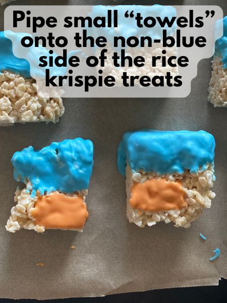 - Don’t overdo the towel decorations: When piping your chocolate towel onto your rice krispie treats, that chocolate will come out pretty fast and it’s easy to end up with a chocolate puddle instead of a chocolate towel. I would recommend going slow and steady for that. Also, if you want to wait until the chocolate cools a bit, it will be easier to work with. Just don’t let it cool so much that it solidifies and clogs up your piping tip.