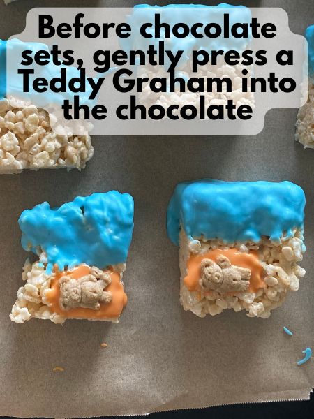 - Before the chocolate sets completely, gently press a Teddy Graham onto the towel so it looks like it’s lounging in the sun.
