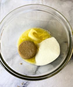 - In a large mixing bowl, mix together melted butter and sugars until smooth.