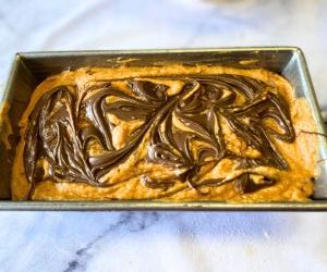 Layer the Batter: Pour 1/2 of the pumpkin batter into the prepared loaf pan. Spoon Nutella over the batter, avoiding the edges. Gently spread the Nutella, leaving a border of pumpkin batter. Then, pour the rest of the batter on top.