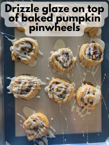 8. Make the glaze: While the pinwheels cool slightly, whisk together powdered sugar and maple syrup (or milk) until smooth. Drizzle over warm pinwheels.