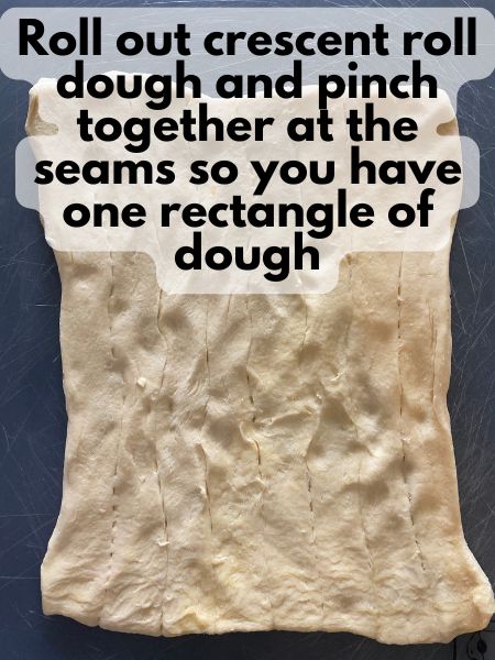- Prepare the dough: Unroll the crescent dough and press the perforations together to form a rectangle. You can also use crescent dough sheets if you want to skip that step.
