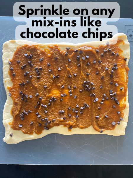 - Spread the filling: Evenly spread the pumpkin mixture over the dough, leaving about 1/4 inch around the edges. Sprinkle with chopped pecans or chocolate chips if using.