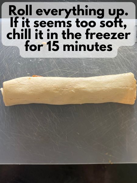 - Starting on the long side, tightly roll the dough into a log. You can chill the log in the freezer for about 15 minutes if you feel like it's too soft to cut into slices right away.