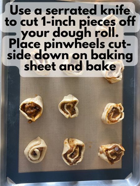 7. Bake: Place the pinwheels cut side down on the prepared baking sheet. Bake for 12–15 minutes, or until golden brown and puffed.