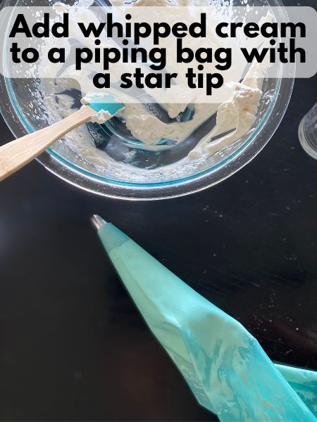 - Put whipped cream in a piping bag with a star tip (I like the Wilton 1M tip)