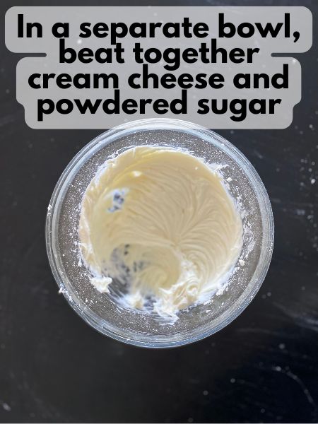 - Beat the softened cream cheese and powdered sugar together until smooth and fluffy.