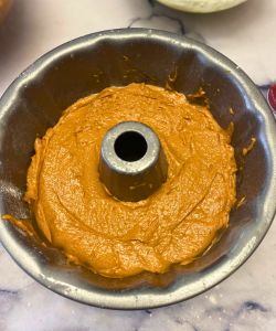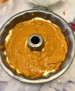 - Pour half of your cake batter into the prepared bundt pan. Smooth it over with a rubber spatula.