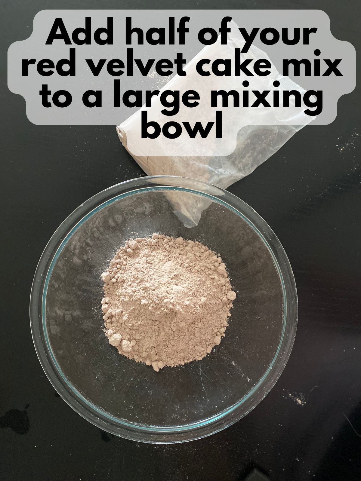 • Add the full brownie mix and only ½ of the red velvet cake mix to a large mixing bowl. You can use a food scale to get a more accurate measurement for half of your cake mix or just eyeball it.