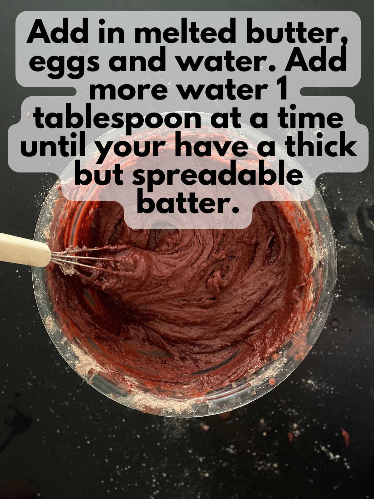 • Add the wet ingredients: 2 eggs, ½ cup melted butter, and ¼ cup water.