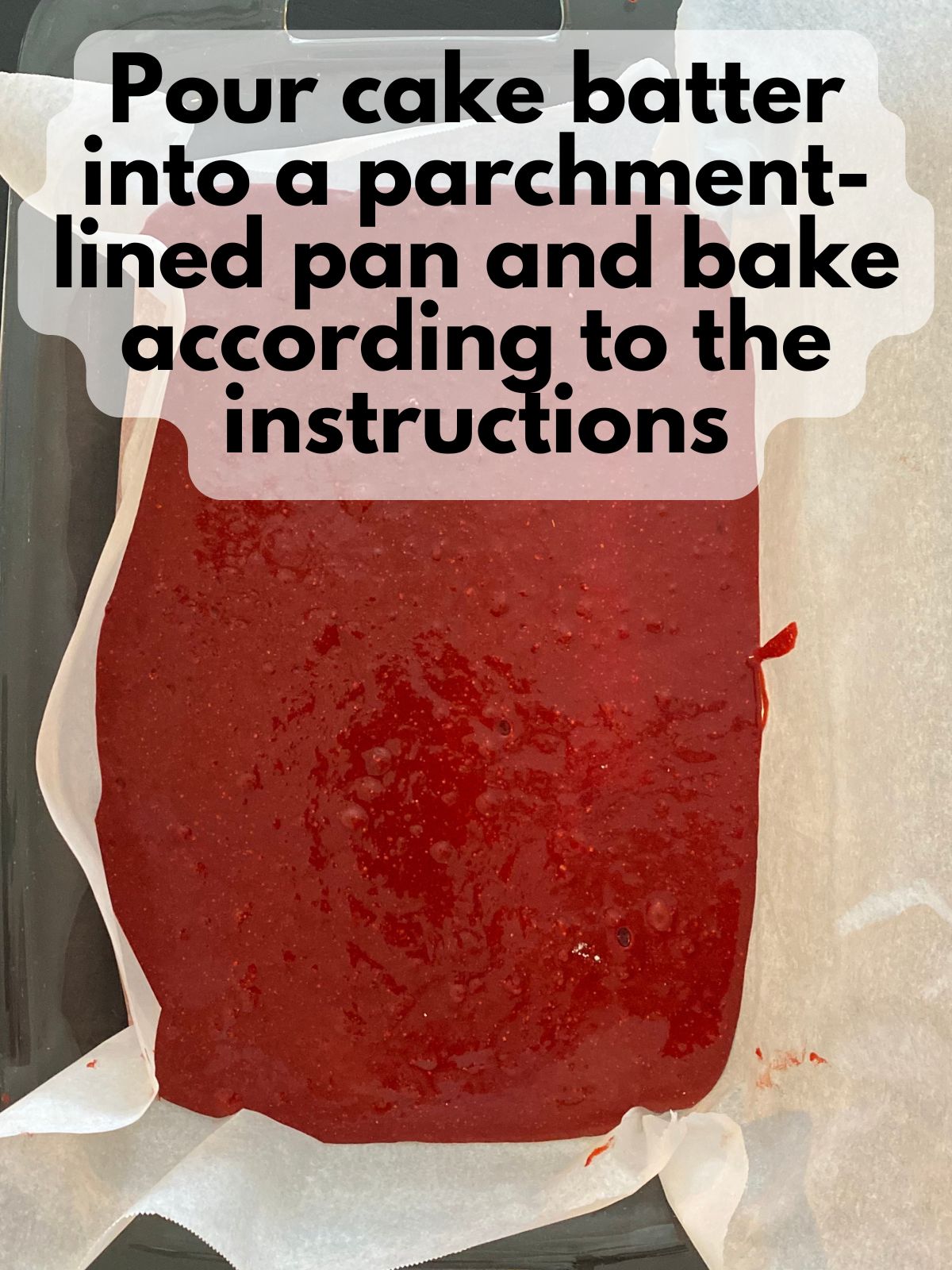 2. Prepare the red velvet cake mix according to package directions using the eggs, oil, and water amounts listed.