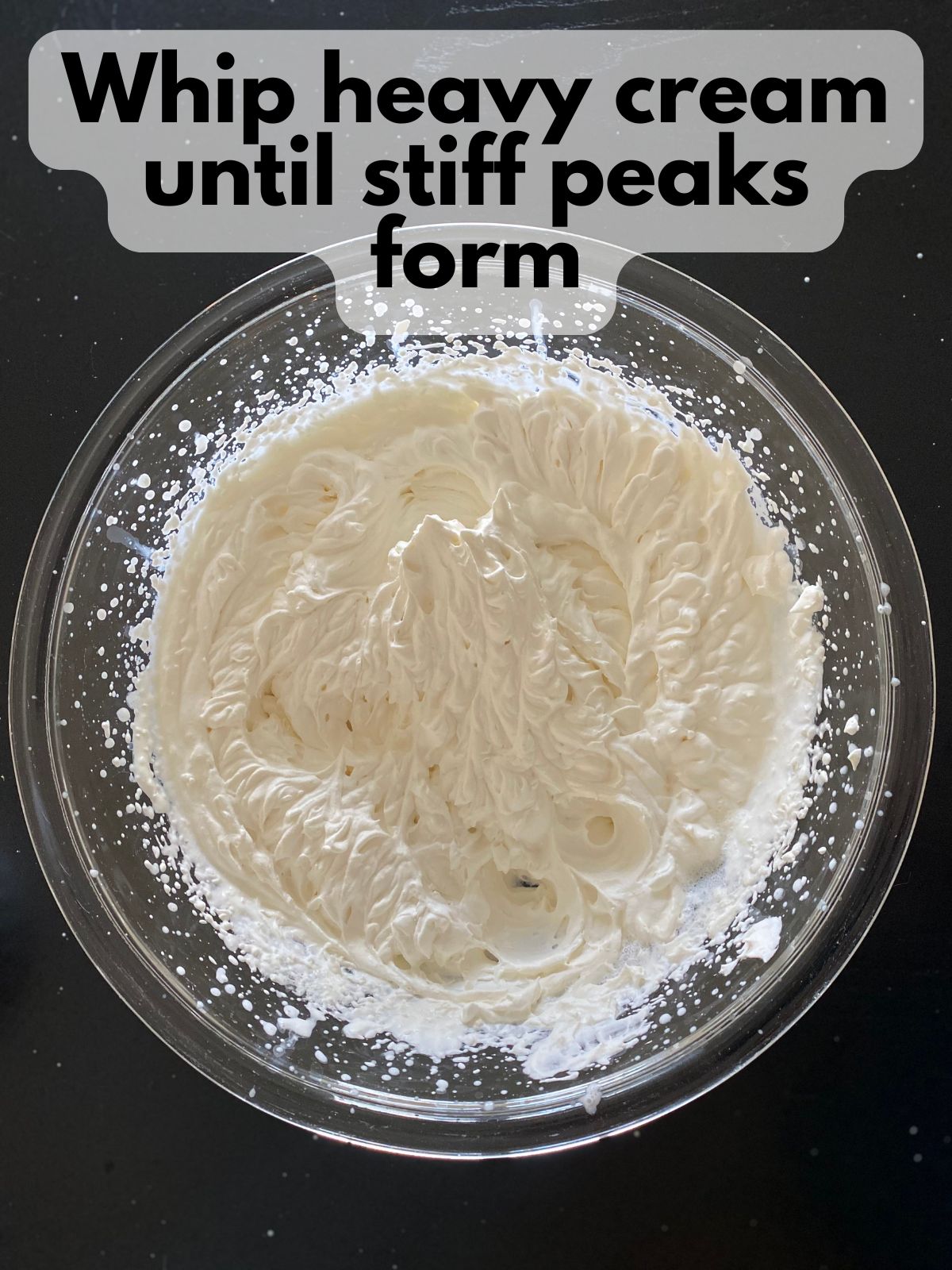 2. In another bowl, whip the heavy cream until stiff peaks form. You can add a little granulated sugar to the cream if you prefer extra sweetness (I didn’t use any and I thought these tasted great, but it depends on your audience.).