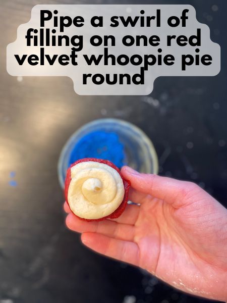 • Once the red velvet rounds are cool, flip half of them upside down. Pipe or spread the filling onto the flat side of each, then top with another round to make a sandwich.