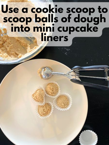 Use a cookie scoop to scoop cookie dough balls into mini cupcake liners. Sprinkle cinnamon sugar on top. You can also roll it into little balls and then roll them in cinnamon sugar and skip the cookie scoop. Chill them in the fridge for at least 30 minutes for best results.