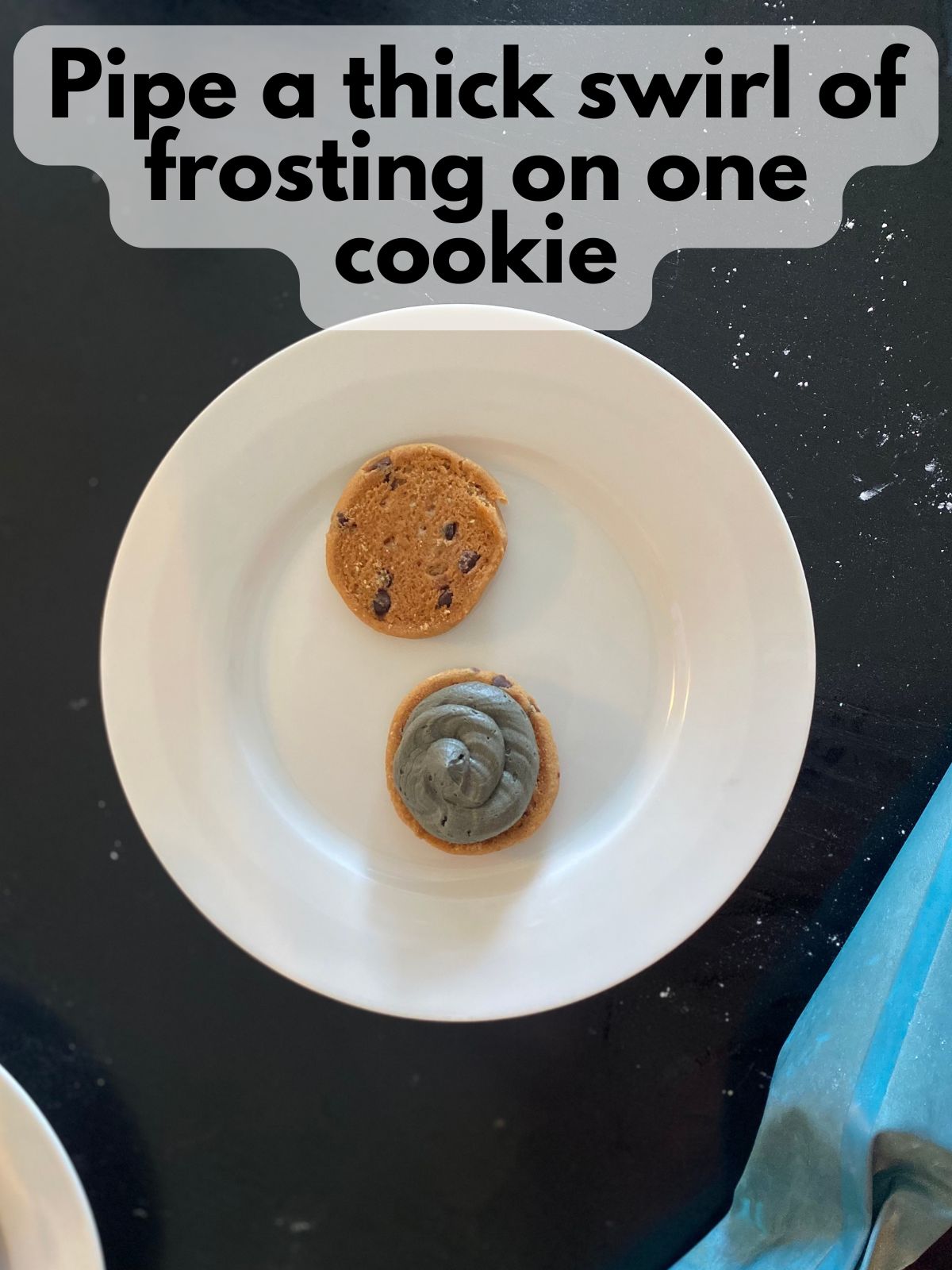 Flip over one cookie and pipe or spread a generous amount of black frosting on the flat side.