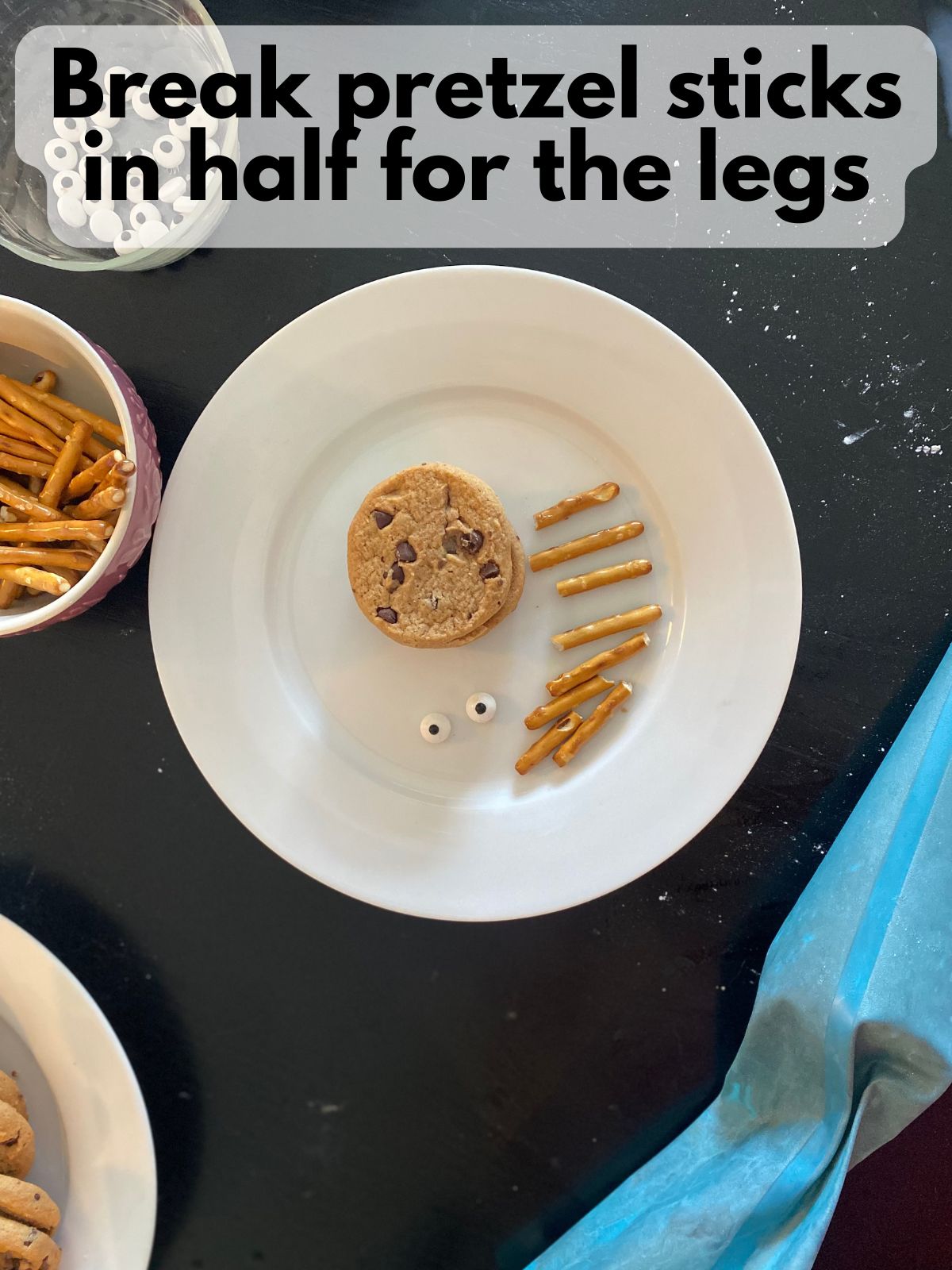 - Break 4 pretzel sticks in half and press 4 pretzel halves into each side of the frosting to act as legs. It helps to place the pretzels at a slight angle so they stick out and look more spidery.