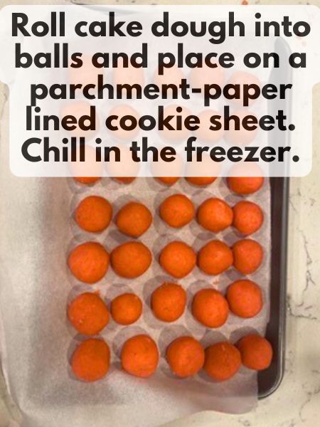 Using your hands or a cookie scoop, roll the cake mixture into 1-inch balls. Place them on a baking sheet lined with parchment paper. Pop the tray into the freezer for about 15-20 minutes—this helps the cake pops firm up and makes dipping much easier.