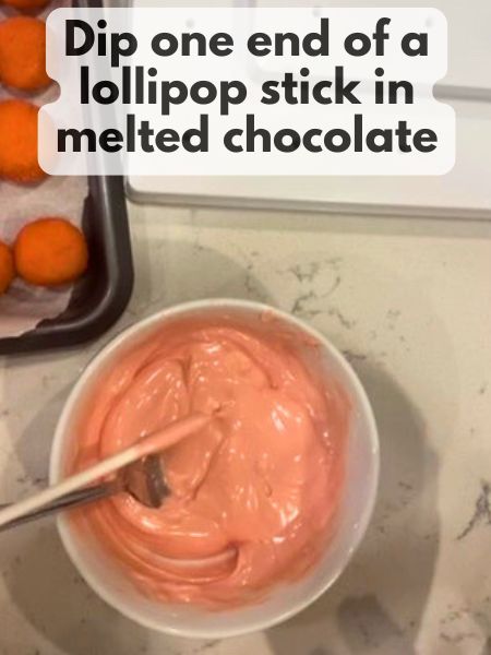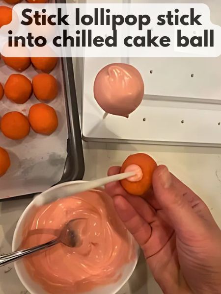 - Dip the end of a lollipop stick in the melted chocolate. Then, stick that end of the stick into the middle of a chilled cake ball. The melted chocolate will act like a glue that holds your cake ball to the stick.