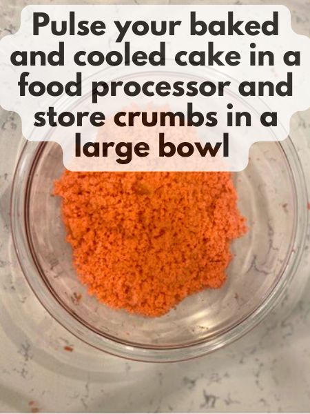 - After your cake has cooled, crumble your cake into fine crumbs and store the crumbs in a large bowl. I like to pulse my cake in a food processor to make this faster.