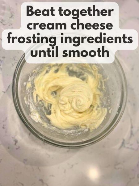 - Mix your frosting by beating softened cream cheese and butter together until smooth. Slowly add powdered sugar and vanilla to cream cheese and butter. Keep beating until everything is smooth.