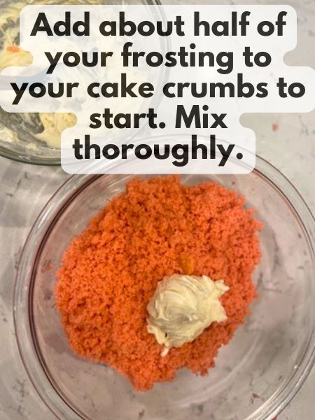 - Take about half of the frosting you made and add it to the bowl with your cake crumbs. Use an electric mixer to mix the frosting into the cake crumbs. Keep adding frosting a little bit at a time until your cake and frosting resemble a dough that you can mold into a ball that holds its shape.