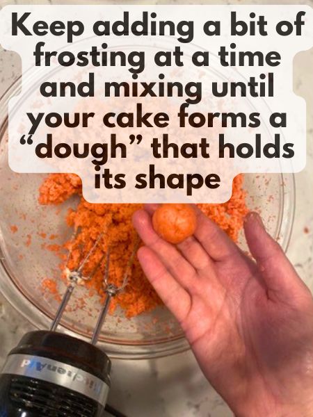 - Don’t Overdo the Frosting- You want the cake mixture to hold together, but too much frosting can make it overly soft. Start with half the frosting and add more only as needed. You’ll probably end up with most of the frosting being used, if not all, but it’s easier to add more frosting than to have to more cake to get a good cake to frosting ratio.