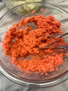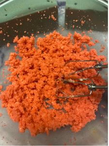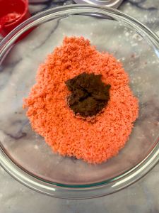 1. Start with about half of your frosting and add it to your cake crumbs. Use an electric mixer to mix cake and frosting together. You want a Play Dough-like consistency. If the mixture is too crumbly and dry, add a little more frosting about ¼ cup at a time. You will most likely use about ⅔ to ¾ of your frosting.