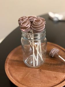 1. Follow the steps above for forming, chilling and decorating your cake pops. I decorated mine with plain milk chocolate candy melts on the outside with a little bit of a pink drizzle. You can buy pink melting chocolate at craft stores, or you can buy white melting chocolate and color it pink.